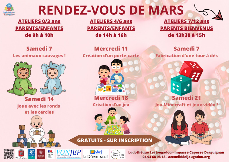 Nos partenaires : Mairie de Draguignan - Ville du Muy - Ville de Fréjus - Ville du Luc - CAF - Caisse des Allocations Familiales - DPVA - Dracénie Provence Verdon Agglomération - Préfet du Var - ANCT - Agence Nationale de la Cohésion des Territoires - Estérel Côte d'Azur Agglomération - FONJEP - FONds de coopération de la Jeunesse et de l’Éducation Populaire - ASP - Agence de service et de paiement - DILCRAH - Délégation Interministérielle à la Lutte Contre le Racisme, l’Antisémitisme et la Haine anti LGBT - Conseil Dépatemental du Var - Service civique - Ministère de l'éducation nationale - CCAS Draguignan - Centre Communal d'Action Sociale - TIPI La tribu de tous les parents - Réseau Parentalité du Var - Association des Ludothèques de France - Myludo - Médiathèque Dracénie - Les dés du dragon - Minute Papillon LAEP - Lieu d'Accueil Enfant Parent - La Fabrique - AQAD - Association du Quartier des Arts de Draguignan - Association Axis Draguignan - Echiquier Dracénois - APS - Pédagojeux - CLEMI - Centre pour L'Éducation aux Médias et à l'Information - SAIEM - Var Habitat